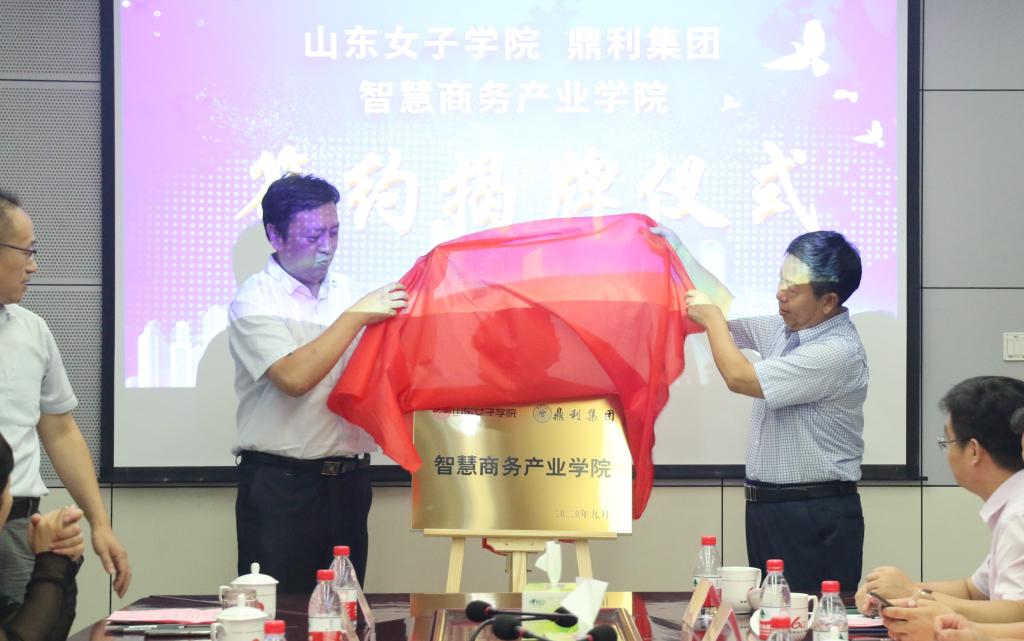 盛国军与曲京鹏共同为“智慧商务产业学院”揭牌。侯素美与鼎利教育山东公司总经理潘新建分别代表校企双方签署战略合作协议.