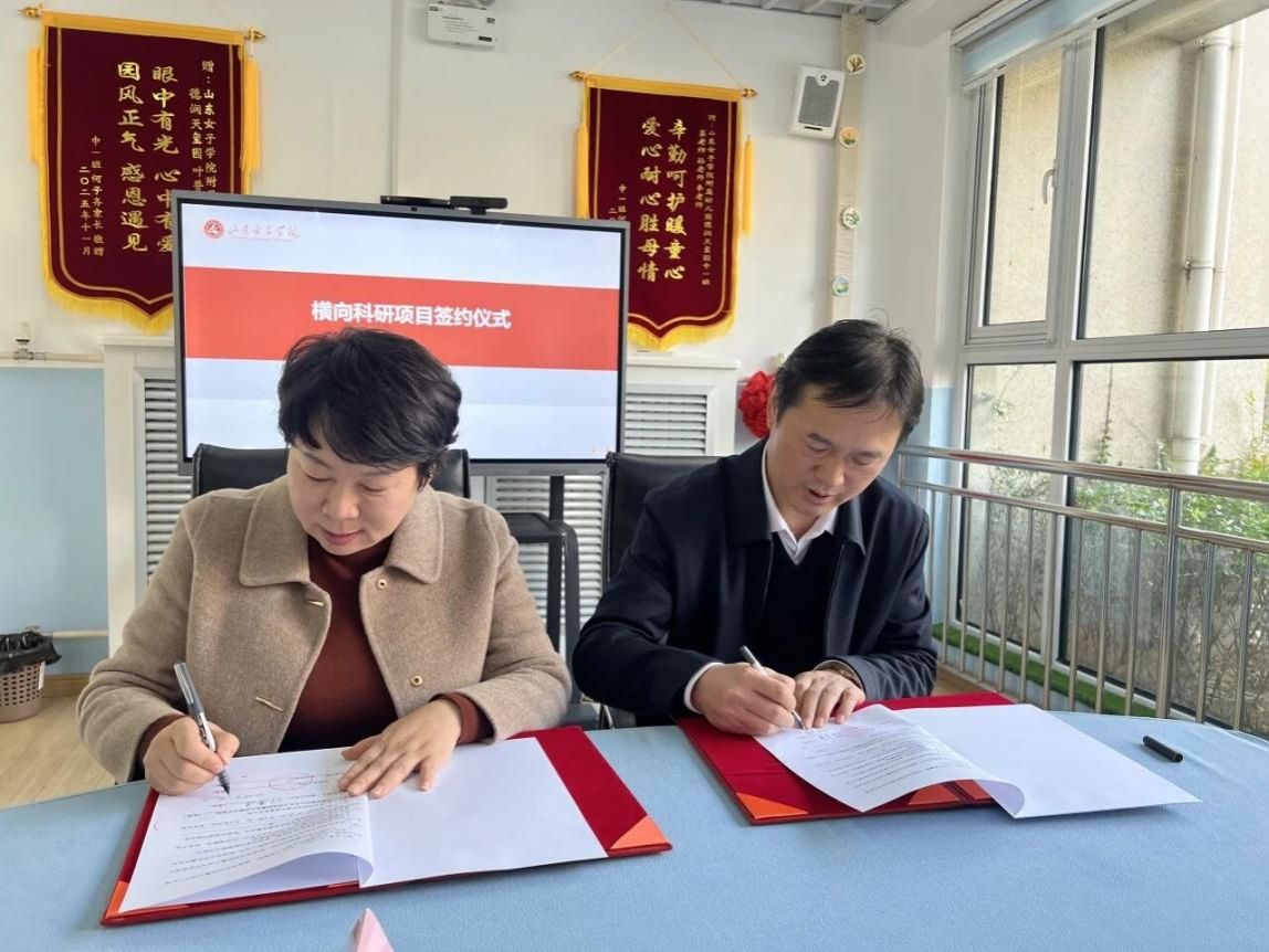 2025年11月29日,学校与济南高新区山东女子学院附属幼儿园德润天玺园横向课题签约仪式在幼儿园一楼会议室顺利举行。山东女子学院合作发展处处长于子云,课题负责人山东女子学院科研处处长董吉贺,天玺园法人代表叶普莲出席会议,课题组成员及幼儿园相关人员参会。